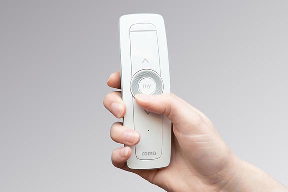 Die handliche ROMA Funksteuerung steuert Licht und Schatten bequem von jeder Stelle Ihres Hauses aus. Lassen Sie morgens vom Bett aus die Rollladen hochfahren. Oder fahren Sie abends von der Couch aus alle Rollladen herunter.